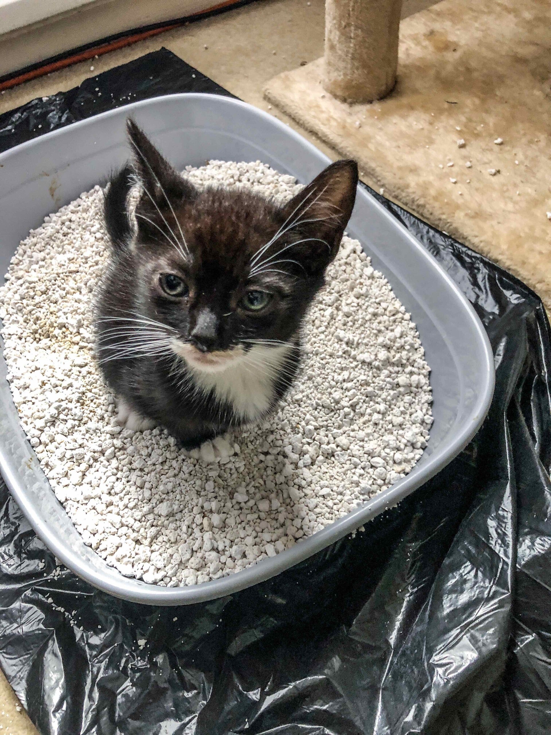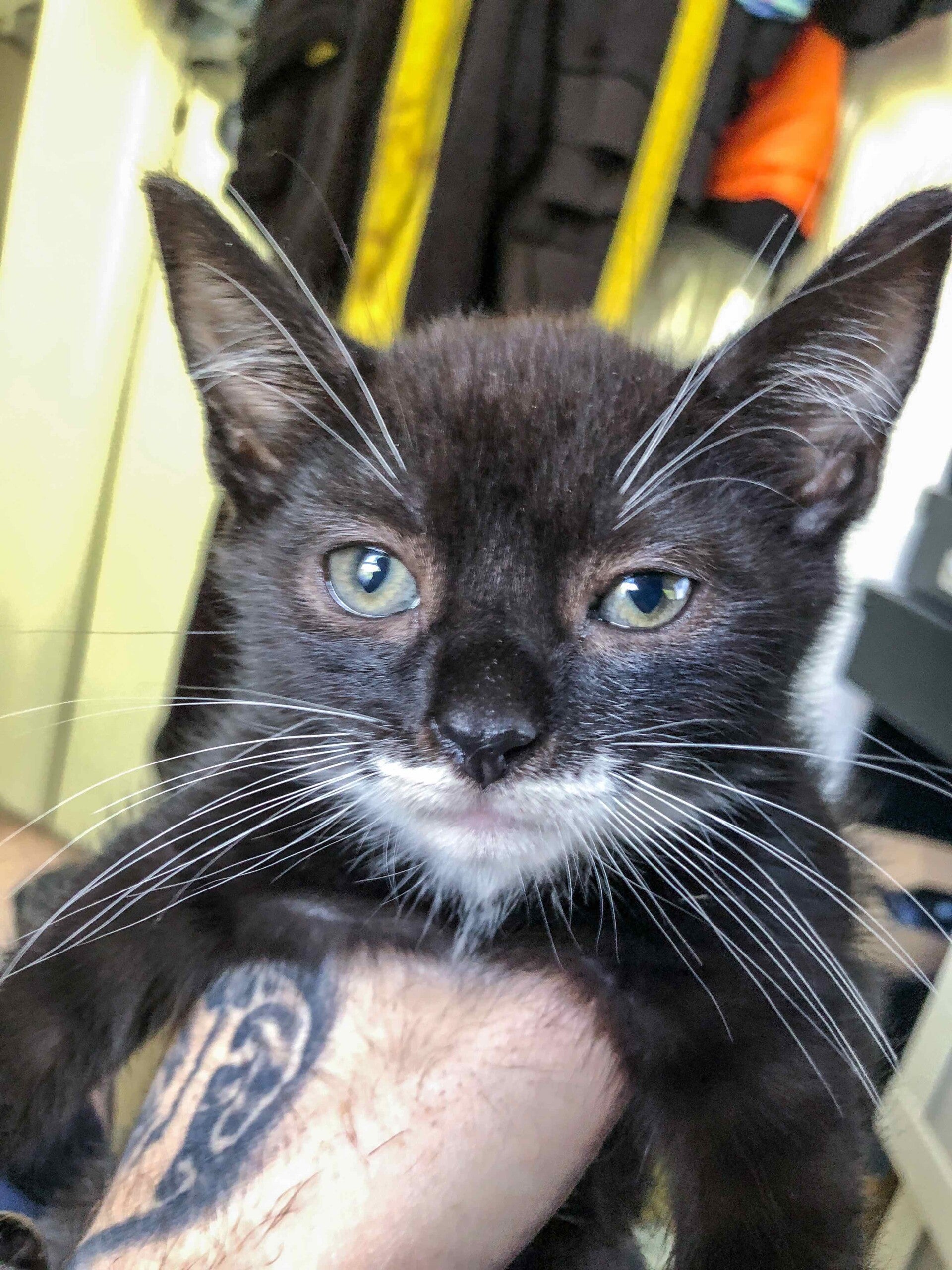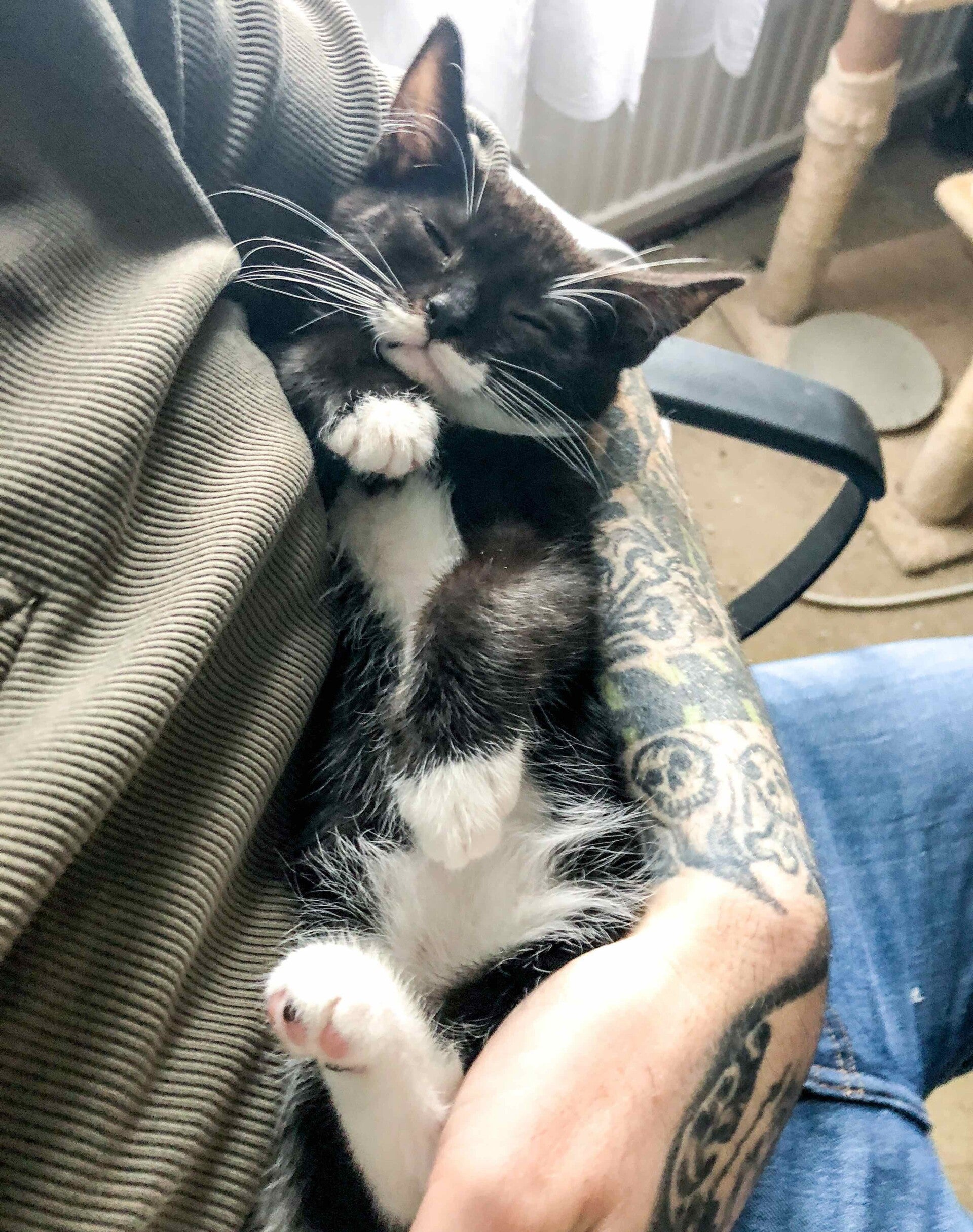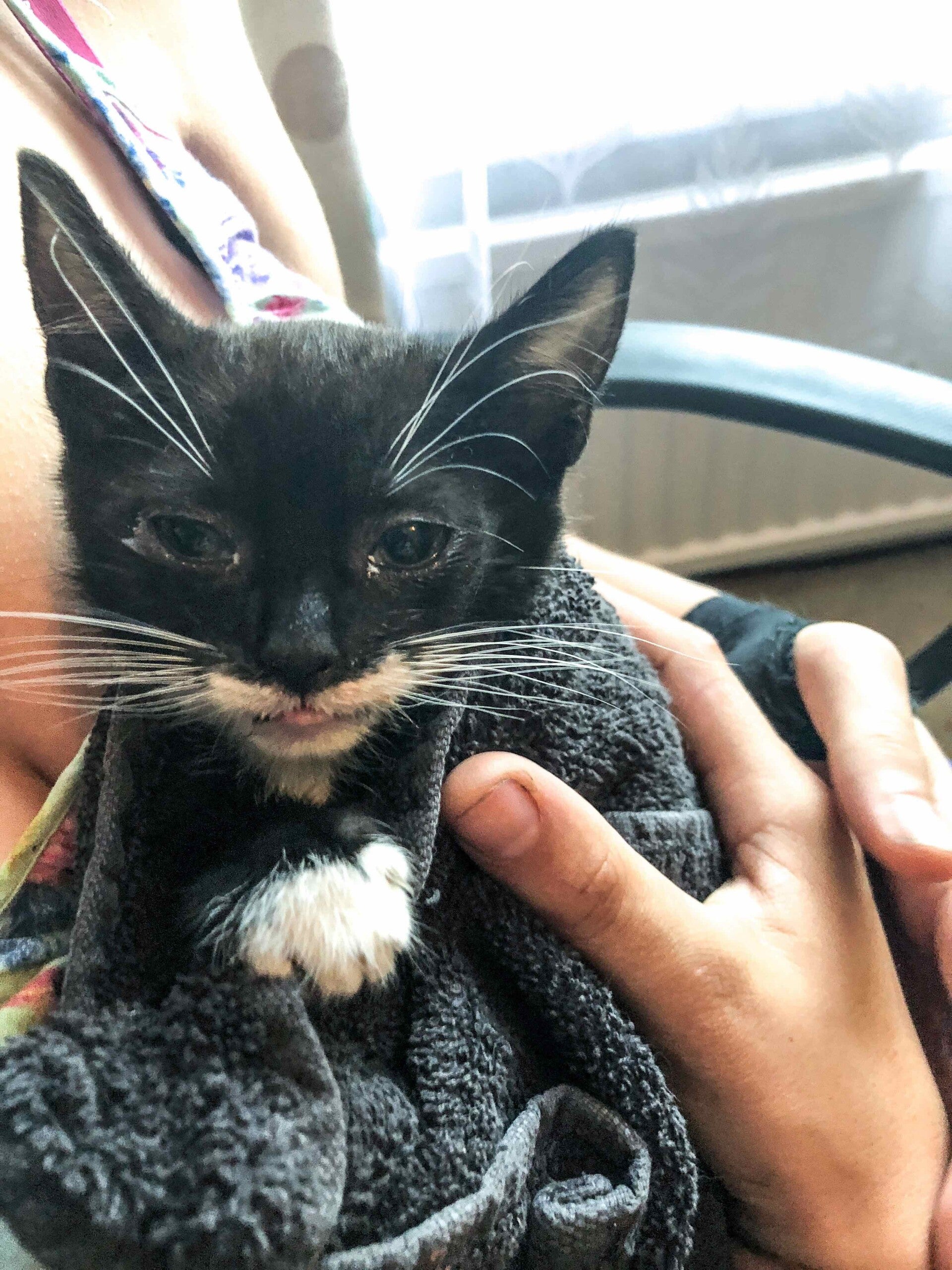 Neegy was a feral kitten just several weeks old living amongst a colony of cats in a carpark in East London 2018. Also there were his siblings and mum. I trapped Neegy, his two siblings and mum then took them back home with me and got them all to the vet the next day as they were suffering from cat flu. They all eventually recovered after several weeks. Although their mum was friendly, Neegy and his siblings (Sultana and Raisin) were feral so it was quite a while before they became friendly.