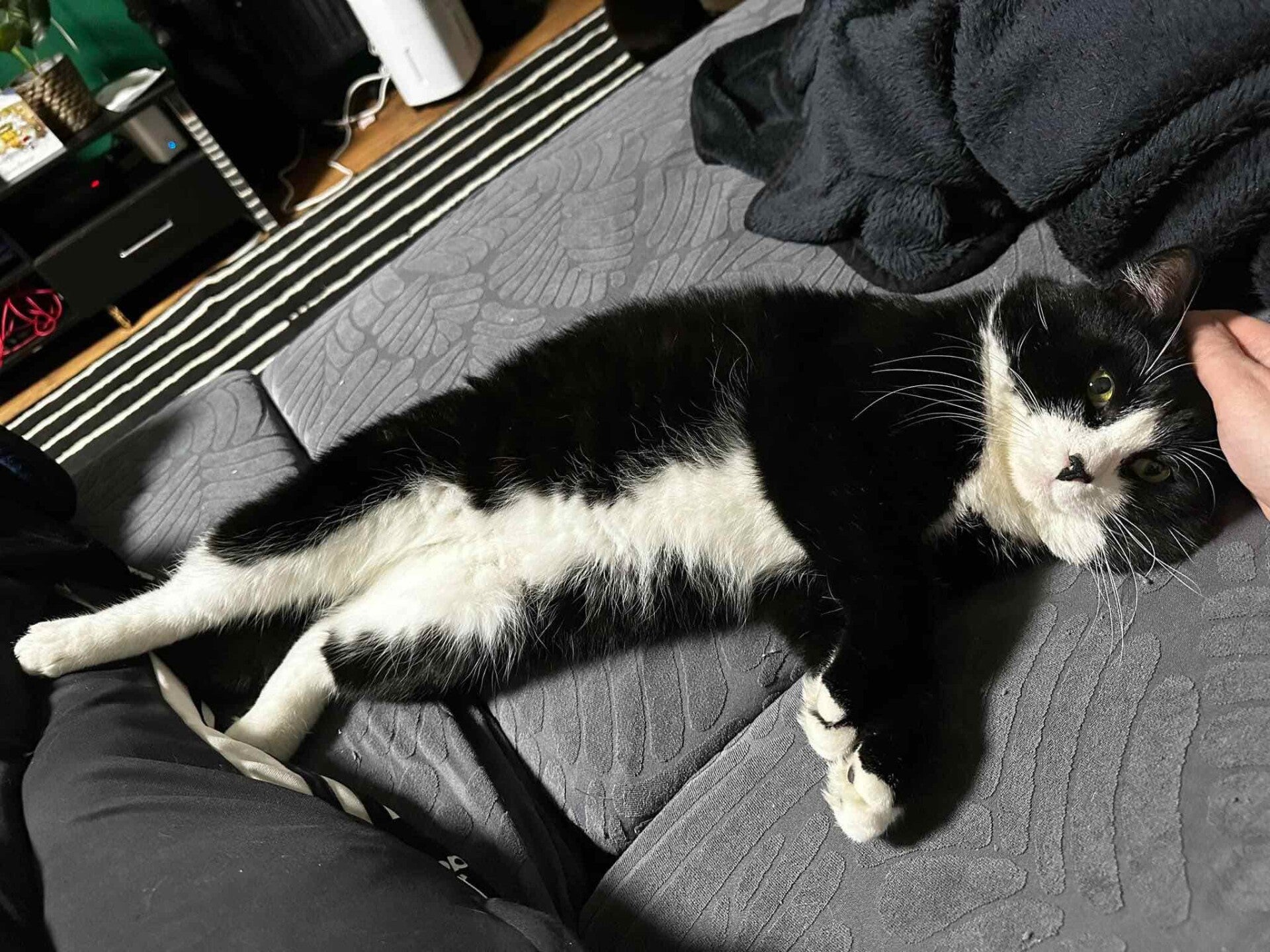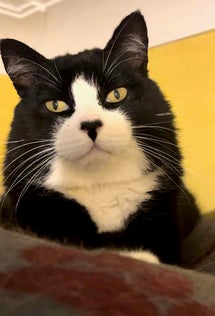 Ronnie is around 3 years old. He was an un-neutered cat, fighting a residents cat in the Borough which I live. I was alerted about this and was able to trap him after two days and then got him neutered a couple of weeks later via Waltham Forest Cats Protection. Ronnie was so scared when he first came in, he was having a panic attack in the temporary holding crate. After several weeks of being very nervous of me he started to come out of his shell. Ronnie is now a super lovely big bear. He's the biggest cat at the Sanctuary but also one of the biggest wimps. He runs off from most people other than myself. He loves bed time and he gets me all to himself at night in bed, he snuggles right into me. He loves to lie on his back, often looking to see if you are looking at him whilst he’s doing so.